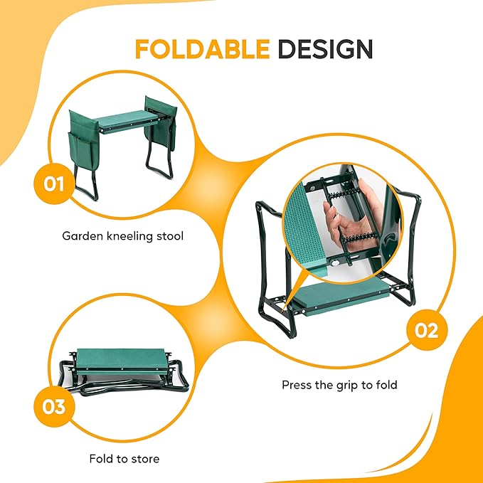 - Comfortable and Sturdy: Protect your knees! Soft EVA foam pads can reduce back pain and knee discomfort caused by prolonged kneeling. It has a strong steel frame and can hold up to 330 pounds. This kneeling bench enough to get you through your gardening.