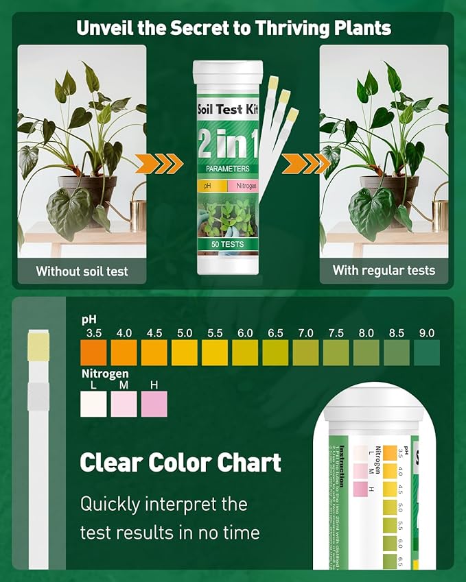- Quick & Accurate Result: Precise test ranges: pH: 3.5-9; Nitrogen: 40-320 mg/kg soil. The ultra-sensitive testing strips capably detect even slight variations. And the easy-to-read color chart helps you instantly interpret the test results