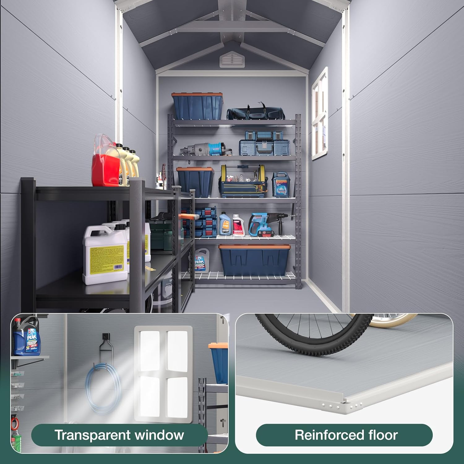 - Good Lighting: The shed transparent windows ensure ample natural light enters the shed, making it easy to find your tools and organize your space without the need to open the window.