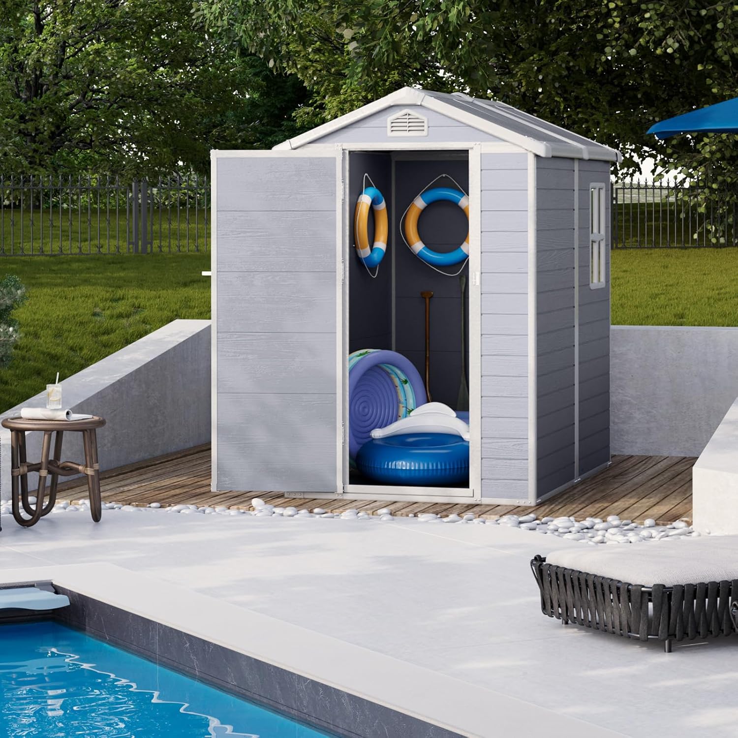 - All-weather Use: Made from premium UV-protected resin, this storage shed is built to withstand extreme weather conditions all year round—no fading, cracking, or warping over time.
