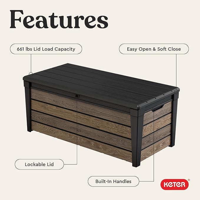 Keter Everwood 120 Gallon Resin Signature Collection Large Outdoor Storage Box for Patio Furniture, Outdoor Cushions, Garden Tools and Pool Gear, Walnut