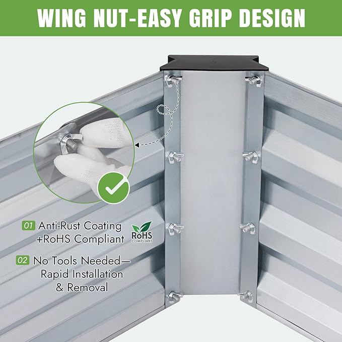- 【Quick & Easy Assembly】 Our metal garden bed is equipped with wing nuts and included tools. The kit features pre-drilled holes, instructions, and gloves. This rasied planter simplifies need a few simple steps and little time, requiring no technical expertise. Start gardening immediately with this vegetable garden bed!