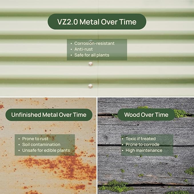 - 🌱Better Material: We have combined a Zinc, Magnesium, and Aluminum coated steel with our award-winning and USDA standard AkzoNobel paint to develop a new material which we call VZ 2.0. The first material of its kind is 100% safe, eco friendly, with a long 20+ year life. VZ 2.0’s exceptional performance has been verified at the Texas A&M National Corrosion & Materials Reliability Lab