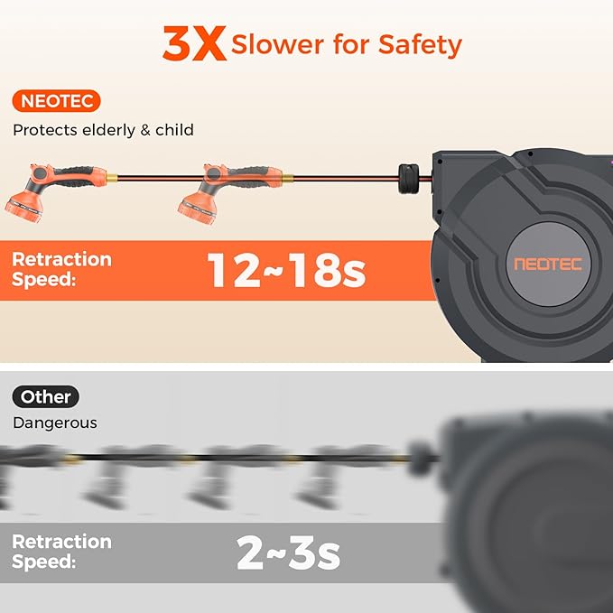 - 50% Slower & Safer Rewinding: Our upgraded slow-return system is 50% slower than others, providing extra safety while the pulley guide prevents tangles for smooth, even storage of your retractable garden hose.