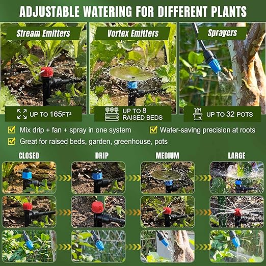 - 【Adjustable Watering for Different Plants】Includes stream emitters, vortex emitters, and sprayers so you can fine-tune drip, fan, or spray for vegetables, shrubs, potted plants, and landscaping. More precise watering helps save water and keeps moisture where plants need it most.Create a precise micro irrigation / automatic plant watering system.